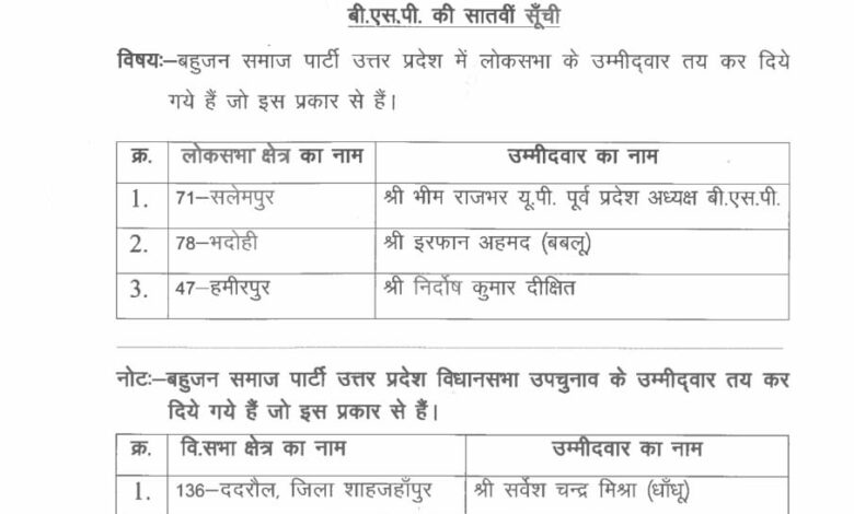 बसपा ने की लोकसभा प्रत्याशियों की 7वीं सूची जारी।