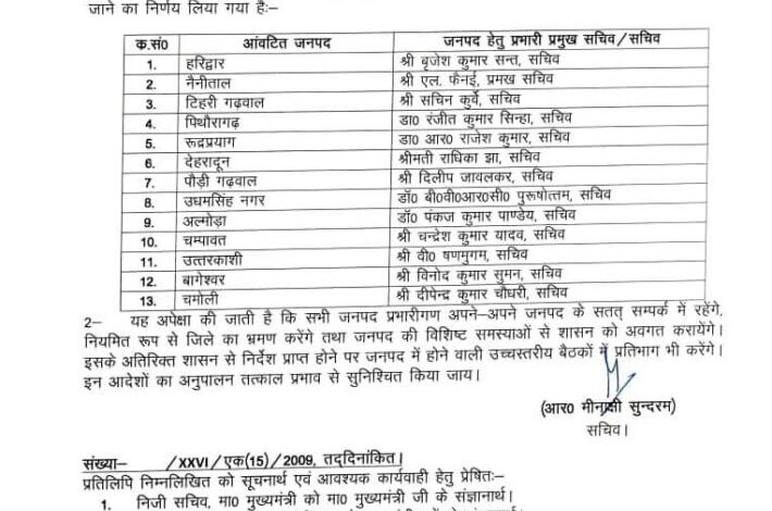 उत्तराखंड : राज्य के 13 IAS अधिकारियों को जिलों के प्रभारी की ज़िम्मेदारी दी गई है।